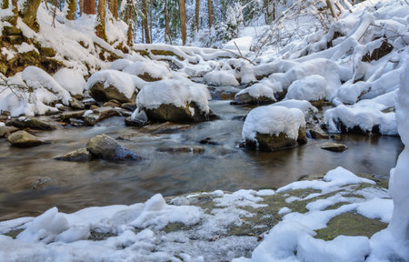 Winter landscape, a small fast stream flows in the forest among the trees, Carpathians, Ukraine.