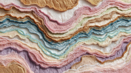 Textured layers of colorful paper are displayed in wave patterns, showing soft hues of pink, blue, and cream. The arrangement captures natural light and creates an inviting atmosphere.