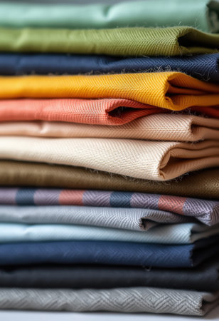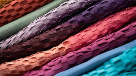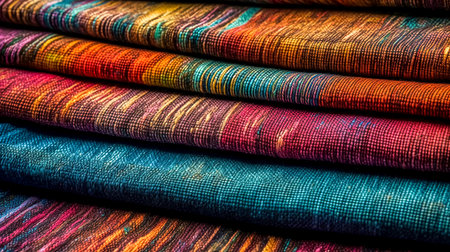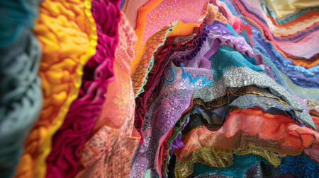 Stacked colorful fabrics creating a mesmerizing and colorful pattern, ideal for backgrounds and textile related projects