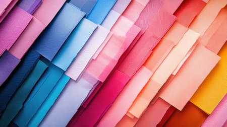 Colorful sheets of paper are layered in a wavy manner, displaying a gradient of colors from soft pastels to deeper tones, highlighting their texture.