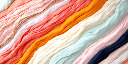 Colorful layers of textured fabric in dynamic waves with vivid patterns and soft hues.