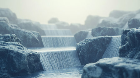 illustration of a mountain river cascading over stylized blocky rocks, the water depicted in smooth arcs, minimal gradient background with distant abstract shapes, low-angle view, zbrush, digital art --chaos 10 --ar 16:9 --v 6.1 Job ID: de3e4576-8b4a-4199-a2d0-3fad428c8de3
