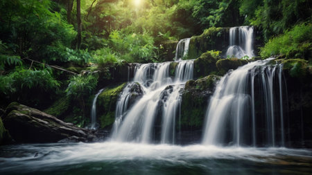 Tranquil and serene waterfall in the lush green forest surrounded by vibrant foliage and mossy rocks