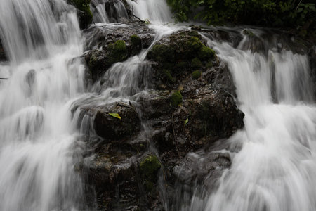 Waterfall close up. Water cascade on moss stones