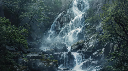 Powerful waterfall cascading down rocky cliffs amidst a lush green forest, creating a mesmerizing display of natures raw beauty and power, with mist and spray adding to the enchanting atmosphere