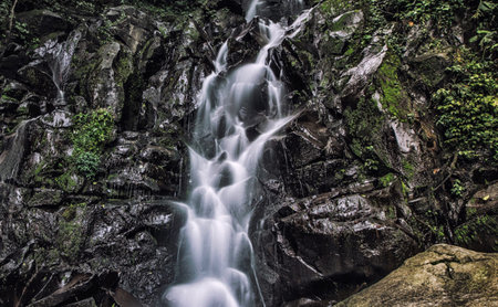 Waterfall landscape. Beautiful hidden waterfall in tropical rainforest. Jungle river. Adventure and travel to Asia. Slow shutter speed, motion photography.