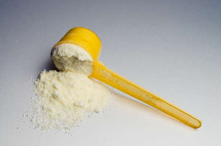 Product photograph of spoon or measuring scoop of whey protein on grey wooden background. Dry mixture for dilution with milk or water.