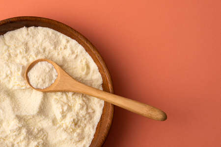 Whey protein powder sports bodybuilding supplement. Top view white porcelain scoop with vanilla flavor powder. Brown background and copy space