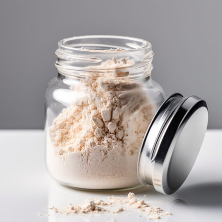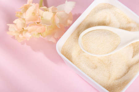 Collagen or protein in powder on gray background. protein powder for making whey drink or collagen cocktail.