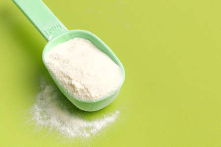 Whey protein powder sports bodybuilding supplement. White porcelain scoop with vanilla flavor powder. Solid color: green