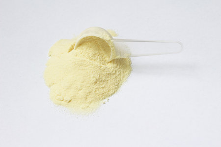 A mountain of soy protein isolate in powder with a measuring spoon on a white background. Vegetarian sports nutrition for cocktails