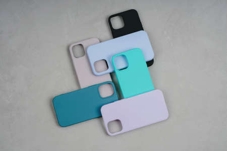 Set of colored silicone cases for the smartphone on the grey background. Protection for the back cover of the mobile phone with a slot for the camera.
