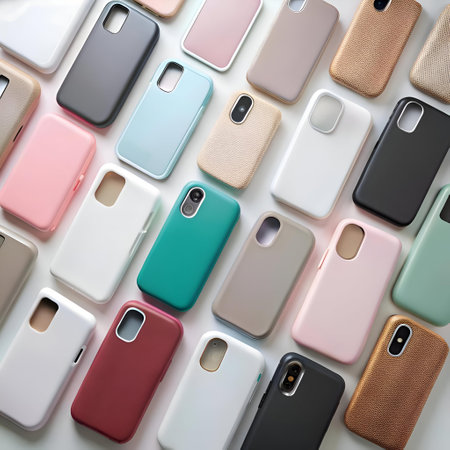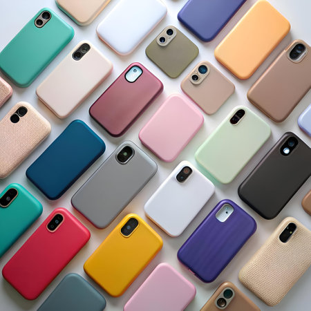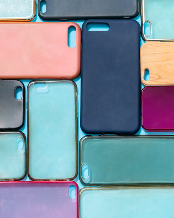 A vibrant collection of colorful phone cases in various materials and styles. Perfect for showcasing your latest phone accessories or promoting a tech savvy lifestyle.