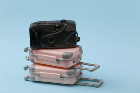Travel, vacation or tourism concept. Two mini travel luggage suitcase and camera on a blue background