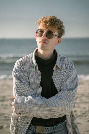 portrait of a pensive guy with curly red hair, looks away, in round sunglasses, in an oversized shirt