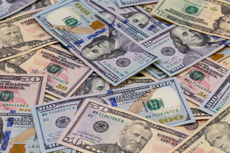 Cash banknotes dollars and euros are mixed up, a close-up shot.