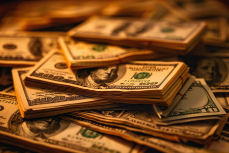 Stacks of hundred dollar bills illuminated by warm light, representing wealth, financial success, and abundance, with a focus on currency details.