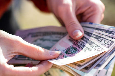 Business Woman Displaying a Spread of Cash US dollars. Close-up. Income and Business concept. Venality, bribe, corruption concept. Hand giving money. Millennial candid authentic female hands counting money usd. Business budget of wealth and prosperity finance