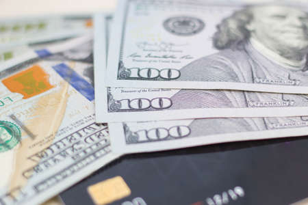 bank card us dollar. American money, cash with credit card. Hundred dollars at bank debit card