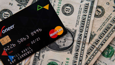 New york, USA - August 24, 2017: Master logo card on dollar bill background close up
