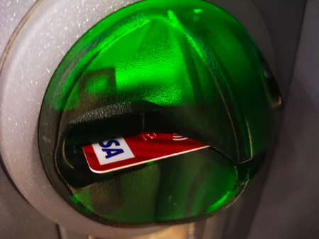 payment debit bank card with the logo of the international payment system Visa at an ATM 14.11. 2020 in Russia, Kazan, st. Spartakovskaya 88b