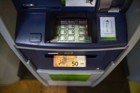 ATM and cash money, closeup. Euro withdrawal from an ATM machine