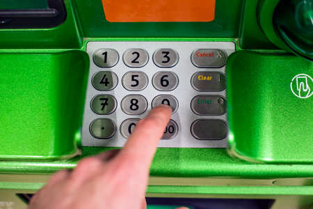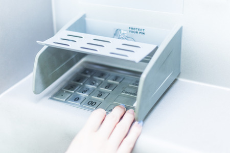 Close up of a womans hand entering secret code on the keypad of an ATM machine