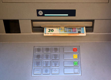 Euro banknote is ejected from the ATM.