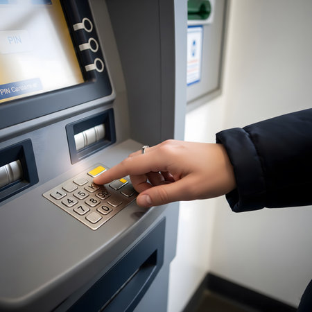 Close-up of a person's hand entering a Personal Identification Number (PIN) on the keypad of an Automated Teller Machine (ATM), emphasizing financial security and banking transactions