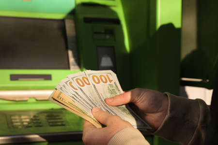 Man withdrawing american dollars from ATM closeup