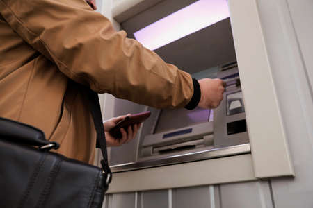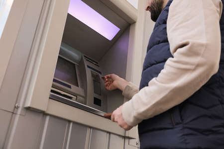 Man inserting credit card into cash machine outdoors, low angle view