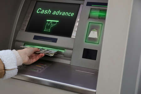 Woman hand showing dollar banknotes in front of the red atm