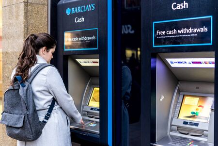 Coventry, UK - March 18, 2017: Pregnant woman making cash withdraw from Barclays Bank in Coventry, UK