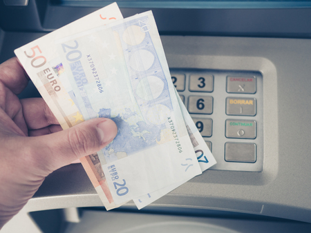 Depositing and withdrawing cash euro banknotes from an ATM. economic and financial concept