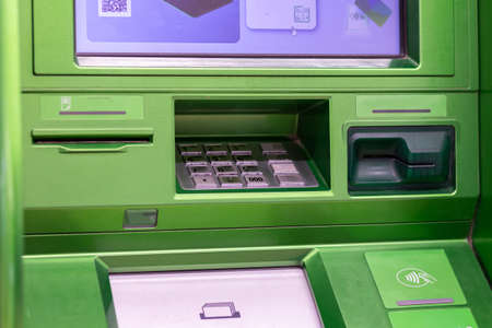 ATM keyboard close-up. Banking and banking, credit cards and cash in ATM. Soft focus and beautiful bokeh.
