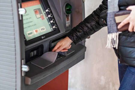 Person insert plastic credit card into street atm bank to withdrawing money