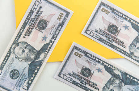 banknotes of dollars on white and yellow background. minimalism, top view, layout