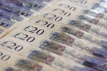 British twenty pounds sterling banknotes closeup. Portrait of Queen Elizabeth II.