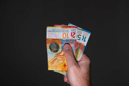 Caucasian male hand holding a bunch of Swiss francs cash banknote close up shot isolated on dark gray.