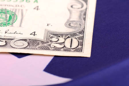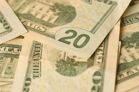 Big amount of old 20 dollar bills details on macro photography. Money earnings, payday or tax paying period concept