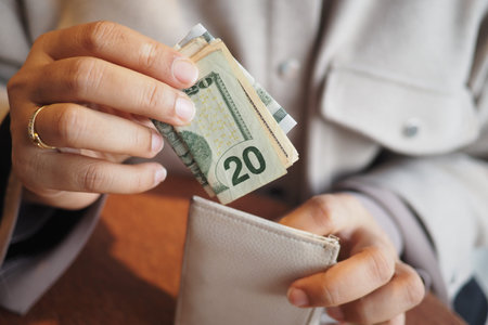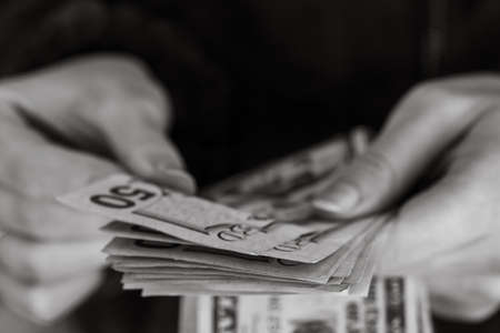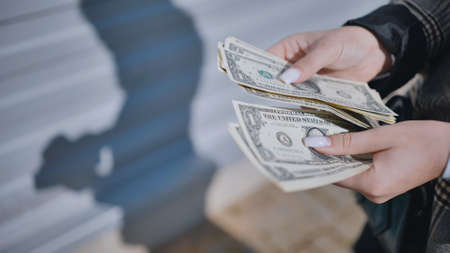 Selective focus on detail of USD banknotes. Counting or giving United States Dollars banknotes. World money concept, inflation and economy concept