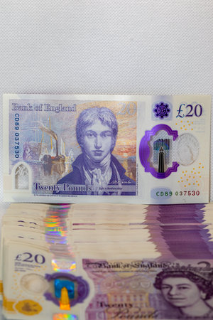 A closeup shot of a single twenty pound British banknote on top of a stack of similar notes, featuring a portrait of Joseph Mallord William Turner on the front.