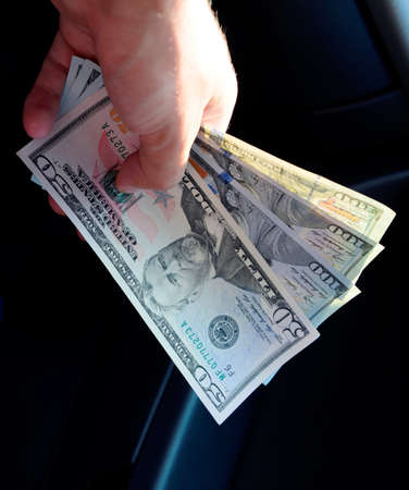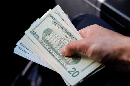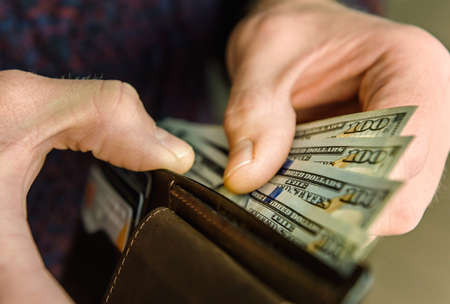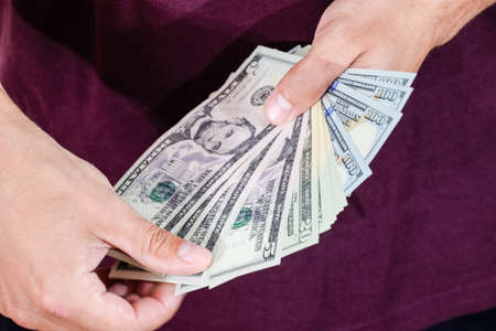 Male hands counting US Dollar bills or paying in cash. Pay expenses.