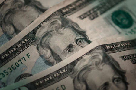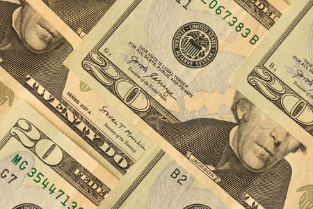 Several twenty dollar bills, showing the face of Andrew Jackson. Extreme macro close up.