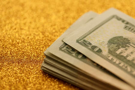 Big amount of old twenty dollar bills on golden background. Money earnings, payday or tax paying period concept