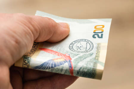hand holding 200 Lempiras banknote in front of him, Honduras, financial and business concept