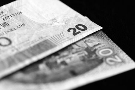 Two banknotes of twenty Hong Kong dollars on a dark background close-up. Black and white