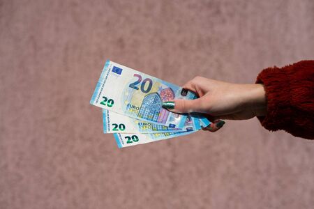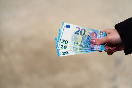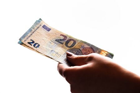 Woman hand holding or giving money like a bribe or tips. World money concept, close up of 20 EURO banknote, photo of EUR currency isolated. Hand holding money, EURO currency