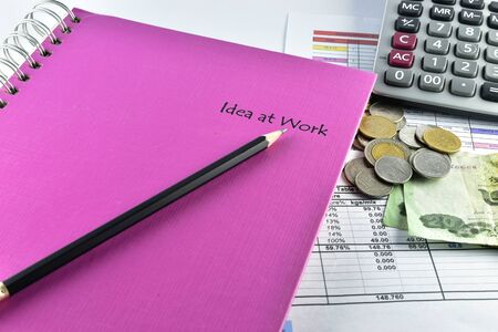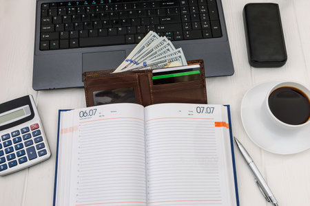 On the table there is a diary and a pen for notes. budget calculation. Money, dollars, financial schedule