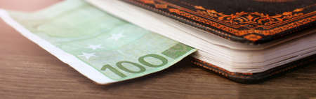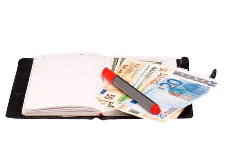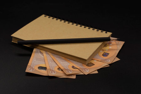 diary with nested euro banknotes and a pencil on top. Budget planning